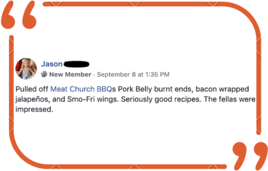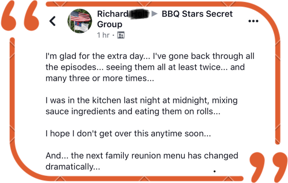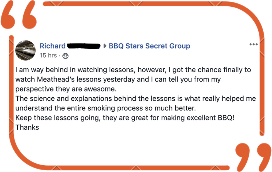 ◉ Access to the private BBQ Stars Facebook community - A great place to connect with like-minded backyard pitmasters and aspiring competitors. Share your cooking wins and challenges, exchange ideas and recipes, and ask for input and advice.