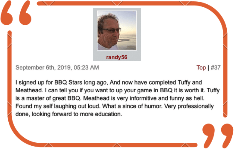 "I’m all over this!!! If you are serious about your grilling but not sure if you want to get to the pro competition level, this is perfect 👌🏽! I love ❤️ that you can keep going back to learn again & again so that you can ‘get it right.’ BRAVO 👏🏽"